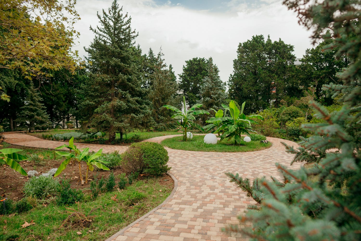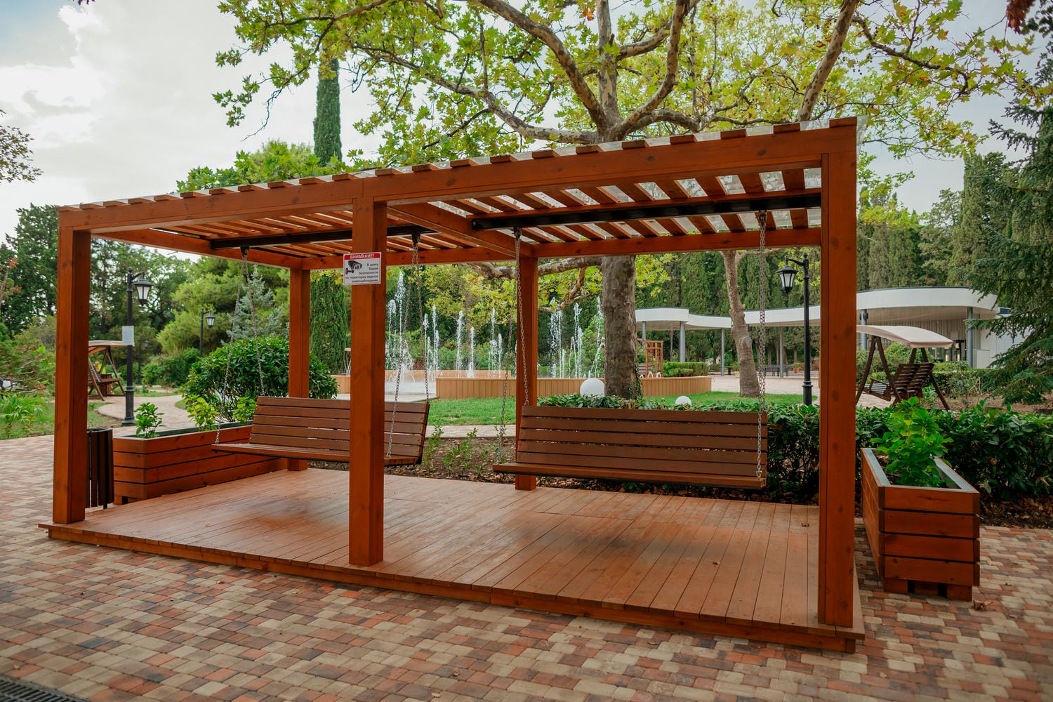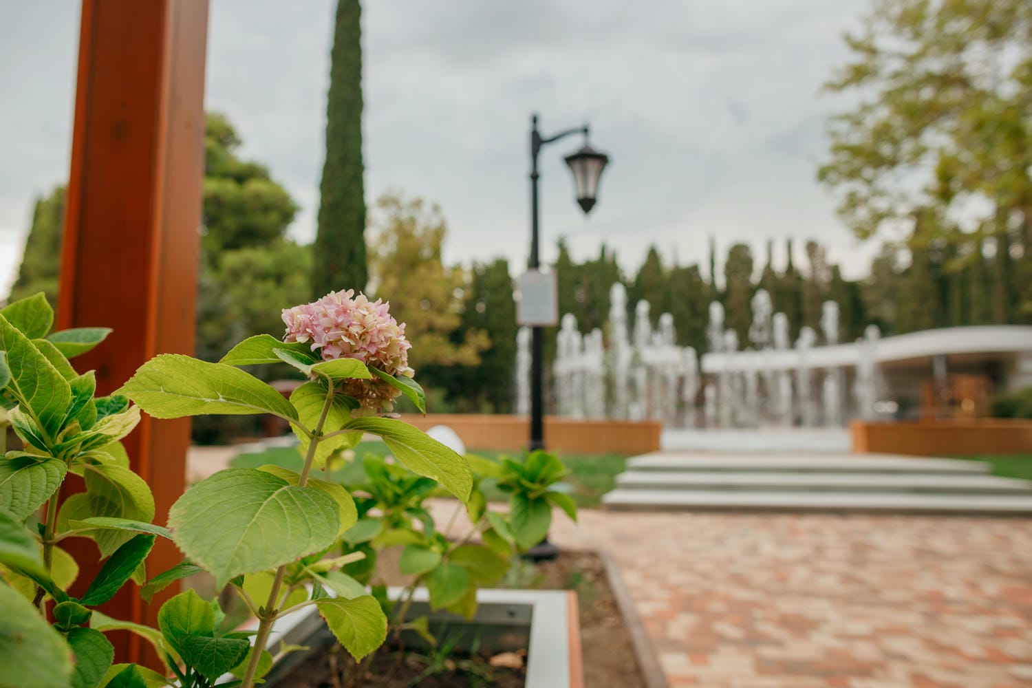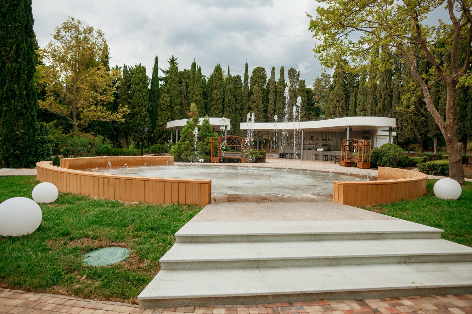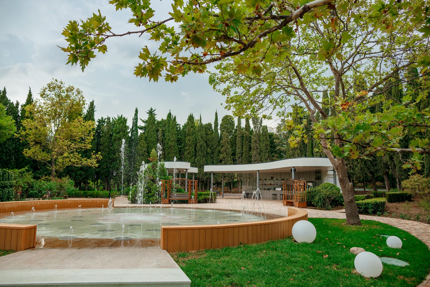 Оригинальна и красива планировка парка: тут и цветочные клумбы, и живописные аллеи, и романтические укромные уголки, площадки для отдыха, беседки, и ротонды - для приема солнечных и воздушных ванн, и декоративные бассейны с «золотыми» рыбками, водной растительностью и фонтаном.