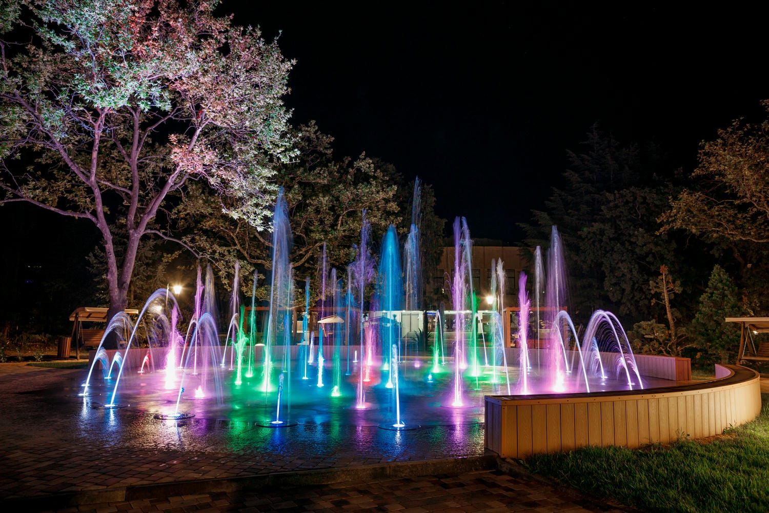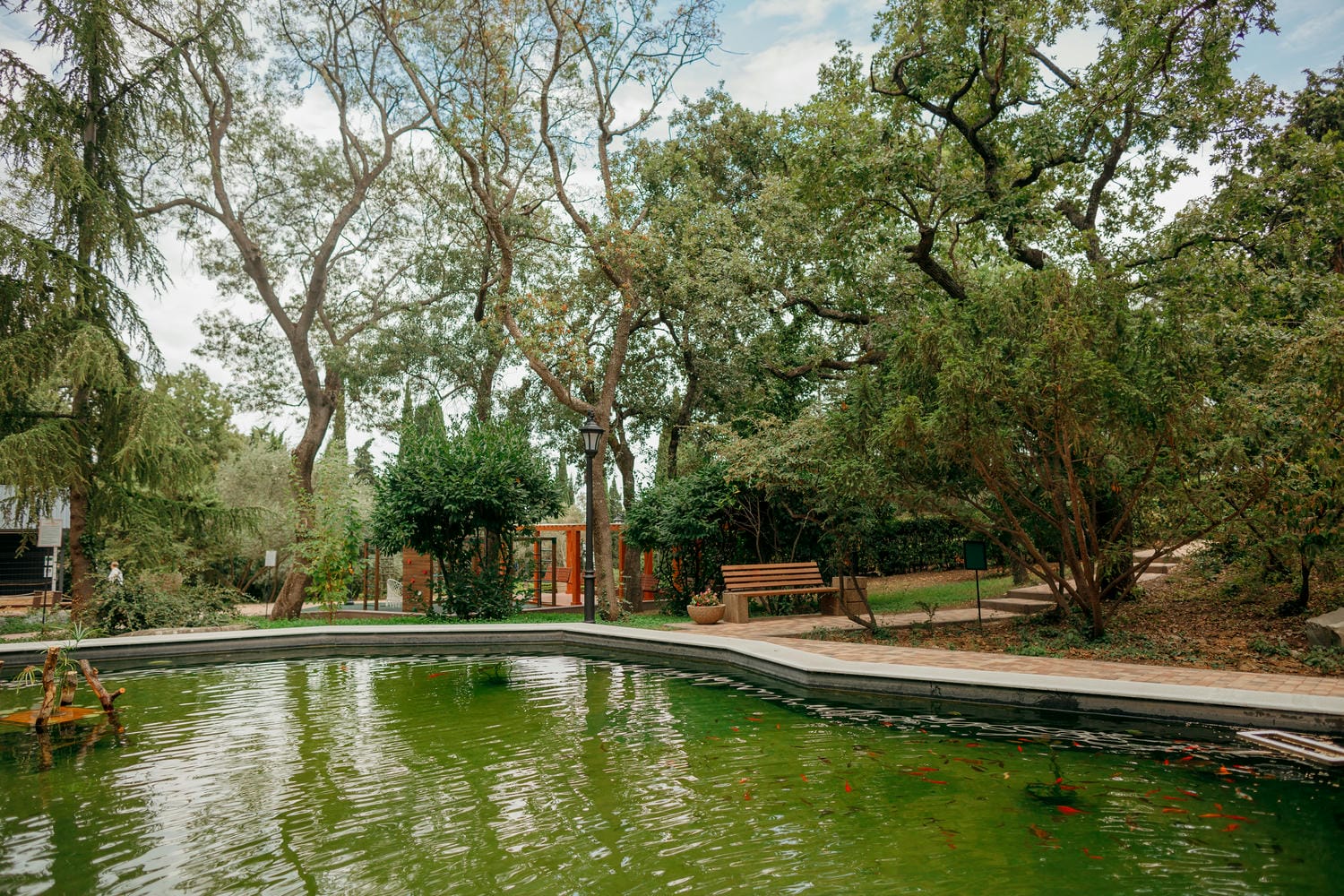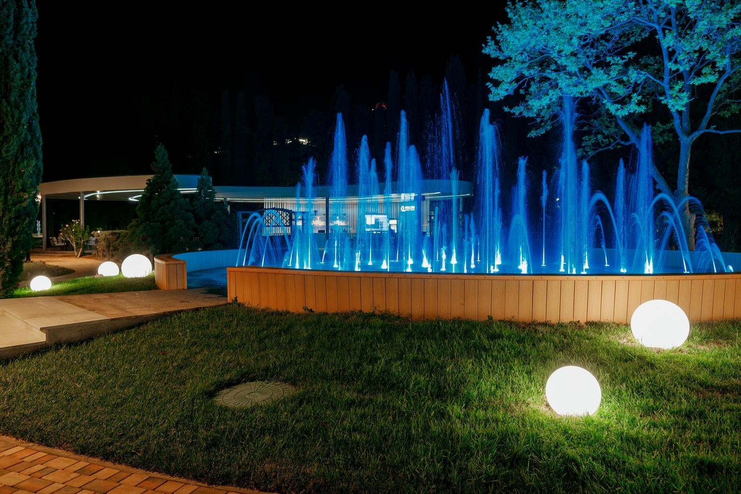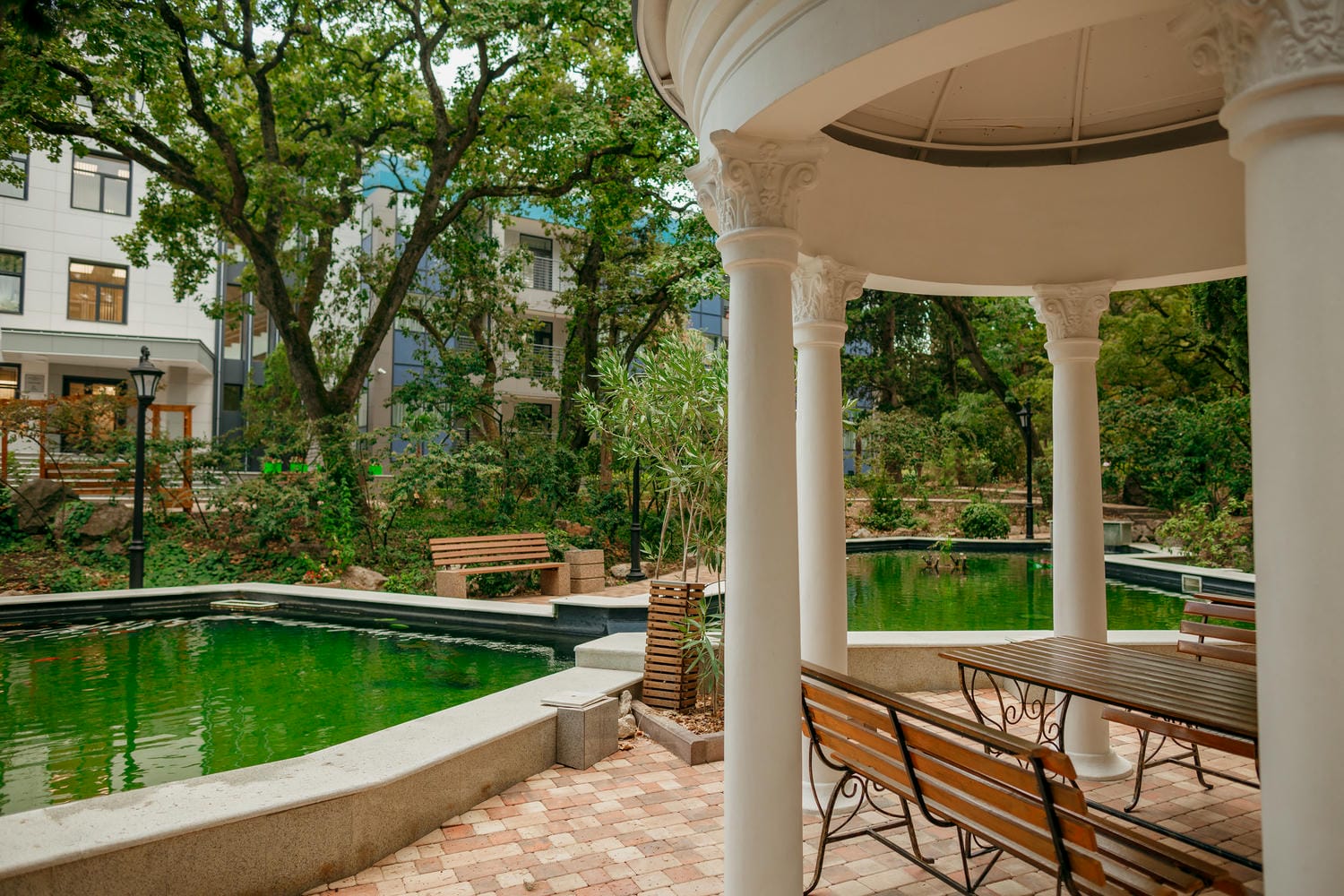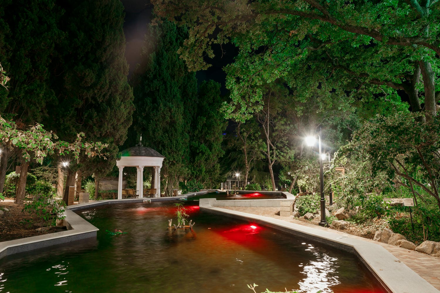 Оригинальна и красива планировка парка: тут и цветочные клумбы, и живописные аллеи, и романтические укромные уголки, площадки для отдыха, беседки, и ротонды - для приема солнечных и воздушных ванн, и декоративные бассейны с «золотыми» рыбками, водной растительностью и фонтаном.