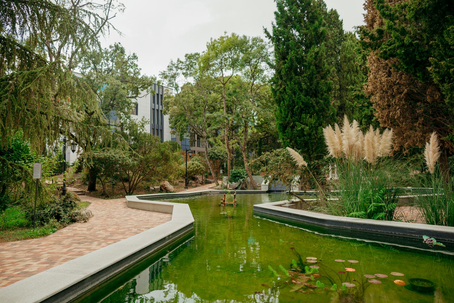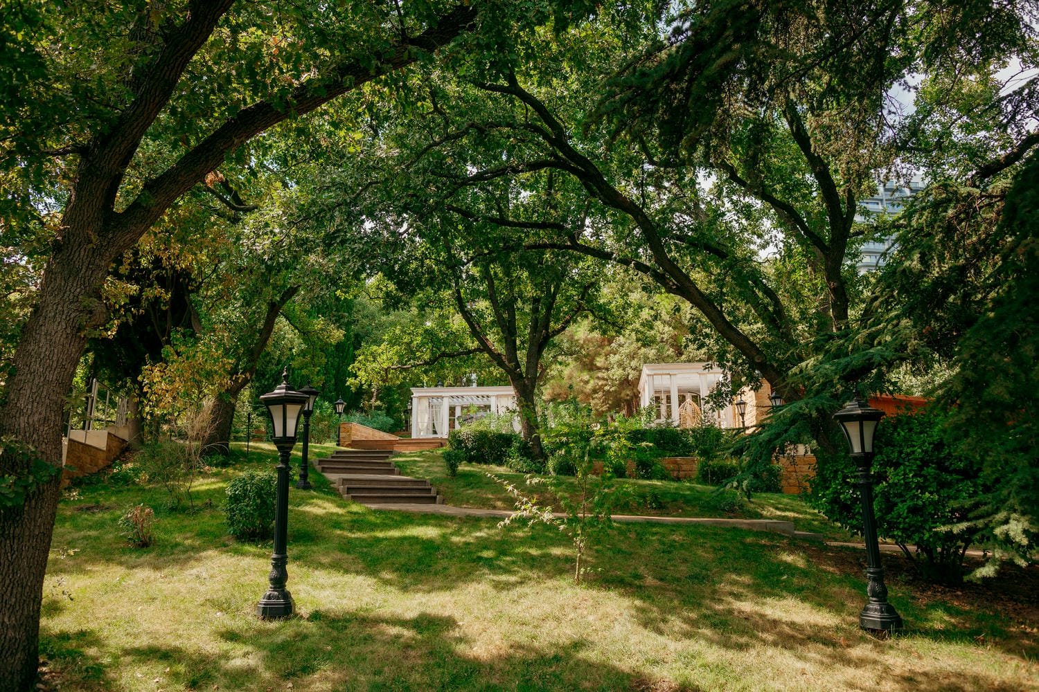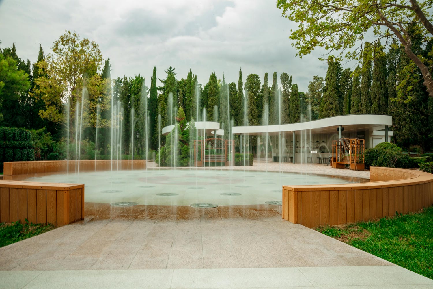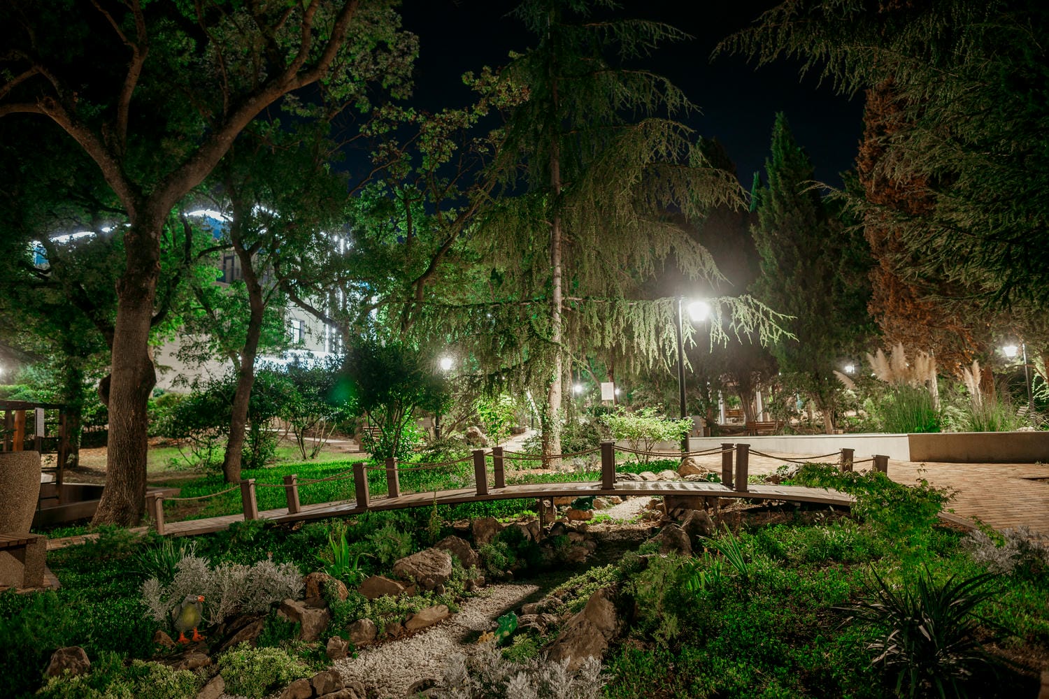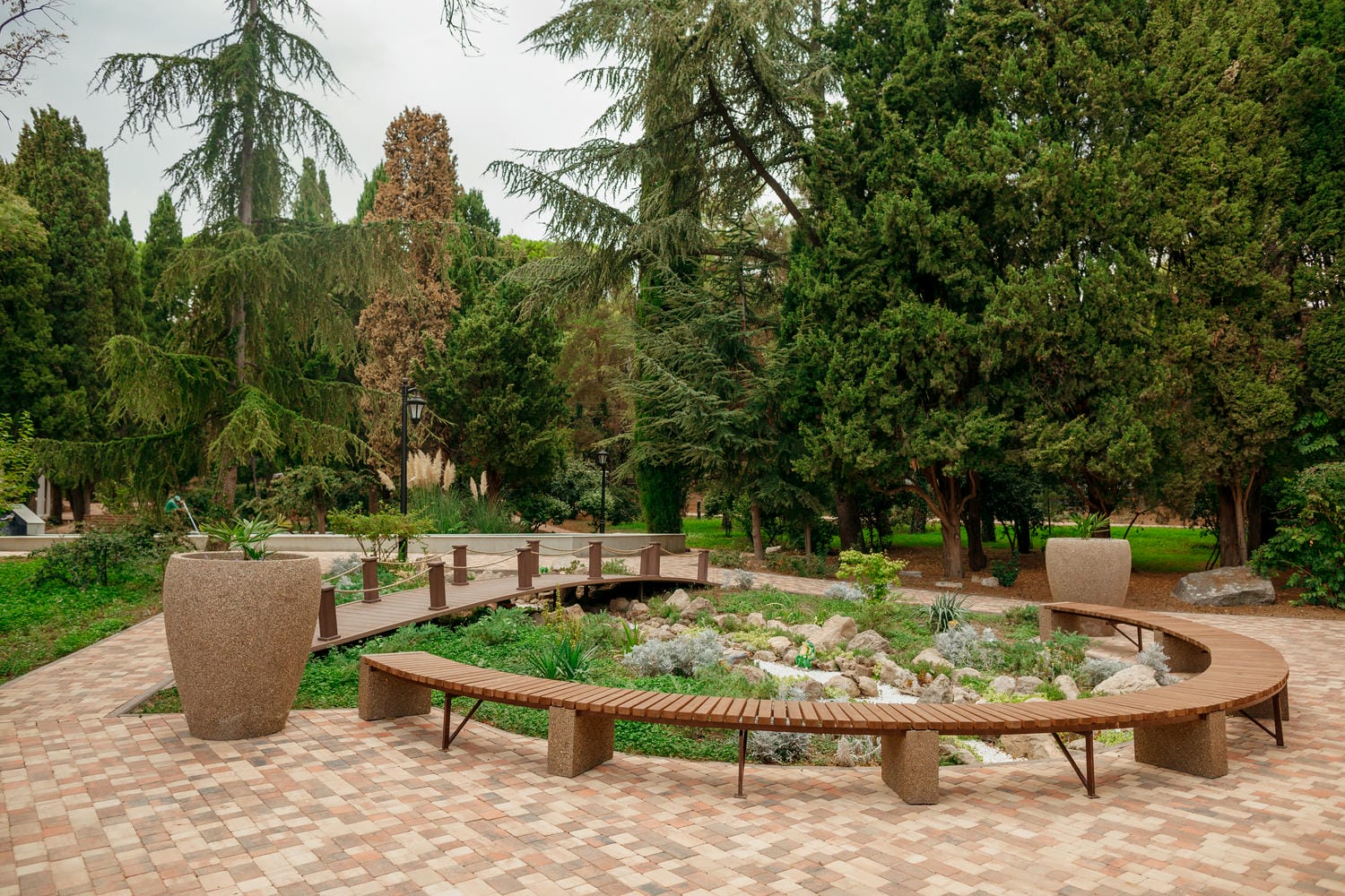 Оригинальна и красива планировка парка: тут и цветочные клумбы, и живописные аллеи, и романтические укромные уголки, площадки для отдыха, беседки, и ротонды - для приема солнечных и воздушных ванн, и декоративные бассейны с «золотыми» рыбками, водной растительностью и фонтаном.